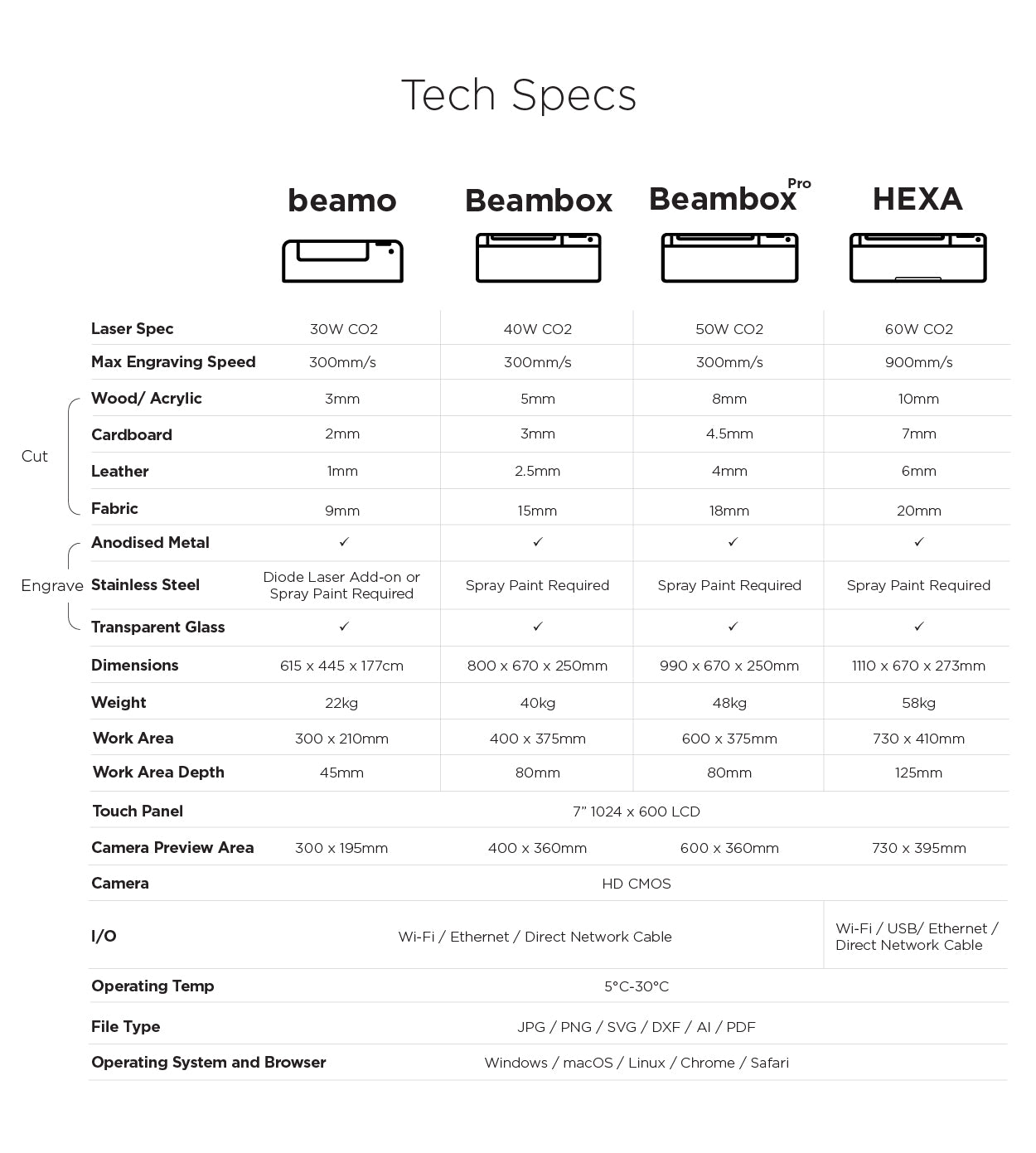 The beamo comes equipped with Beam Studio for PC and Mac and Beam Go for mobile. Our hassle-free software allows you to edit text and vector files and modify bitmap images in app. Easily auto align your designs in the centre of your workpiece or equally distribute designs to cover your working object. Once you’re ready to engrave or cut, enjoy preset parameters for power and speed based on your choice of materials.